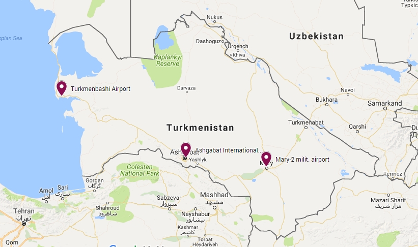وضعیت كنونی: كشور تركمنستان دارای 26 فرودگاه است كه حملونقلهای بینالمللی از سه فرودگاه عشقآباد، تركمنباشی و ماری صورت میپذیرد.