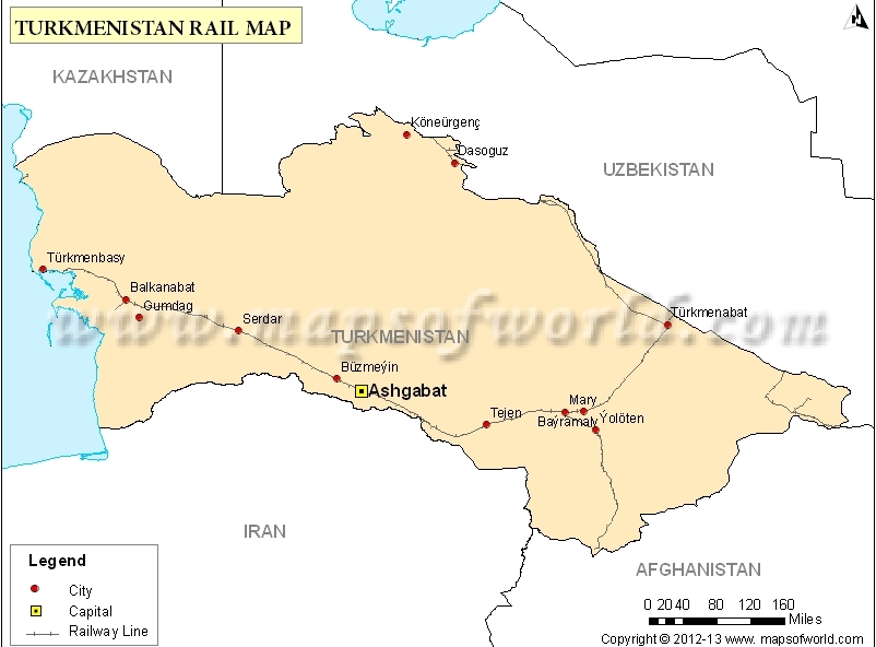وضعیت كنونی: در سال 2015، طول خطوط ریلی كشور تركمنستان، 3115 كیلومتر بوده است كه عمده آن در نزدیكی مرز شمالی و جنوبی این كشور واقع شده است. ارتباطات ریلی بینالمللی این كشور در مرز ایران (باری)، افغانستان (باری و از دو منطقه امامنظر و اكینا)، قزاقستان، ازبكستان و همچنین دریای خزر (مسافری)، انجام میشود. خط راهآهن Uzen – Gyzylgaya – Bereket – Etrek – Gorgan در دسامبر 2014 به عنوان خط ریلی کریدور شمال-جنوب تعیین گردید، که این خط قزاقزستان را از طریق ترکمنستان به ایران متصل میکند و پیشبینی میشود تا سالانه 10 میلیون تن بار از این مسیر حمل شود.
