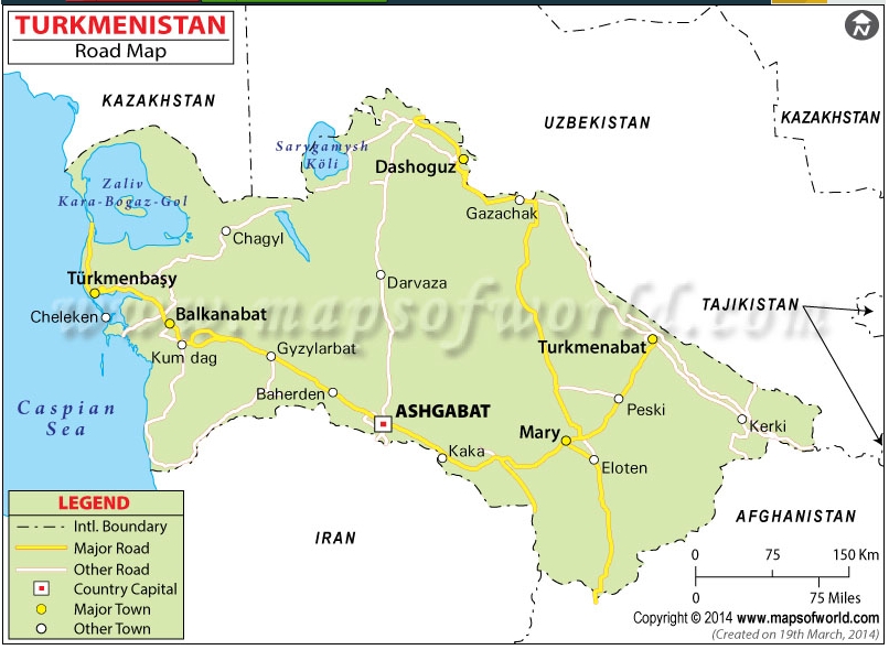 وضعیت كنونی: دو مسیر بزرگراهی اصلی این كشور، از شهر ماری و در امتداد مرز ایران به عشقآباد (شرقی-غربی) و دیگری از تركمنآباد در مرز افغانستان به مرز ازبكستان است. از سال 2011 تا 2015 دولت تركمنستان برنامه تکمیل جاده (Turkmenbashy -Ashgabat Mary – Turkmenabat – Farap) از دریای خزر به مرزهای ازبکستان را داشته است.