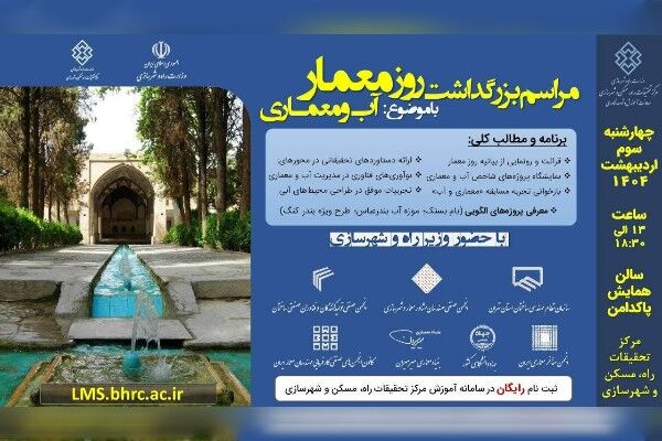 در همین راستا، مراسم بزرگداشت روز معمار، با موضوع «آب و معماری» روز چهارشنبه ۳ اردیبهشت ۱۴۰۴ از ساعت ۱۳ در سالن پاکدامن مرکز تحقیقات راه، مسکن و شهرسازی برگزار خواهد شد.